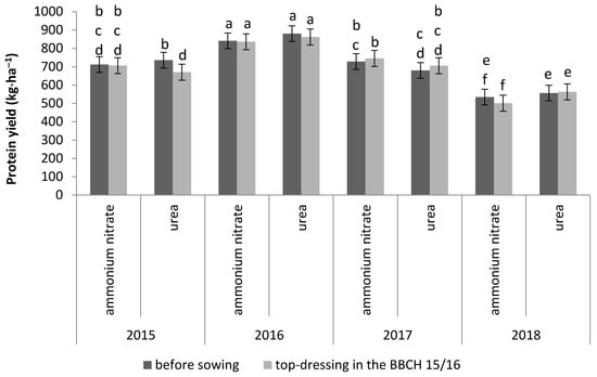 Mean values of the protein yield for the combinations of four years; two types of nitrogen fertilizer and two dates of nitrogen application (YBC); a, b, c, d, e, f—homogeneous groups (α = 0.01).