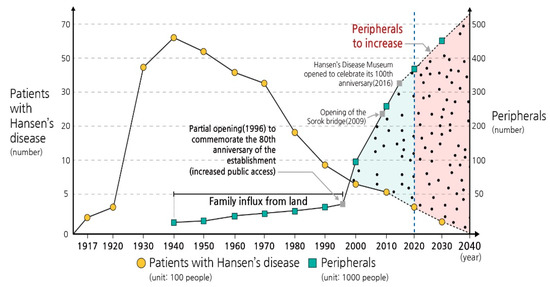 Figure 3). In the process of conserving Sorok-do’s history and memory, the Sorok-do National Hospital Museum (hereafter “SNHM”) was opened in 2016 to celebrate the centenary of the SNH. Furthermore, the World Forum on Hansen’s Disease was held on 1–3 November 2016, in Seoul, on the topic, “Shaping a Better Future: Historic Significance of Hansen’s Disease Cultural Heritage”. Over the last two decades, Sorok-do endeavored to conserve its tangible and intangible values that reflect not only the historic and social significance of the place, but also a local aspiration to build the sustainability of the community for those who suffer from Hansen’s disease in the future.