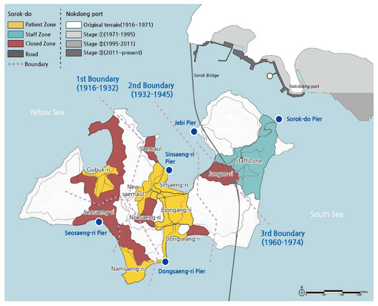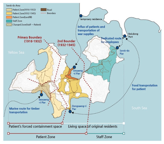 Figure 6). During this period, the Hansen’s disease patients were forcefully relocated to this island for their isolated accommodation. The Japanese Government General of Korea constructed the Jahye Clinic and other facilities (69 buildings, 735 inpatients) on the south-west portion of the island, farthest from the mainland of Korea, and installed fences to separate the space between the patients and employees [