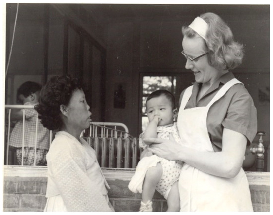 Sister Marianne Stoeger of the Damien Foundation, who takes care of child patients (1960s).