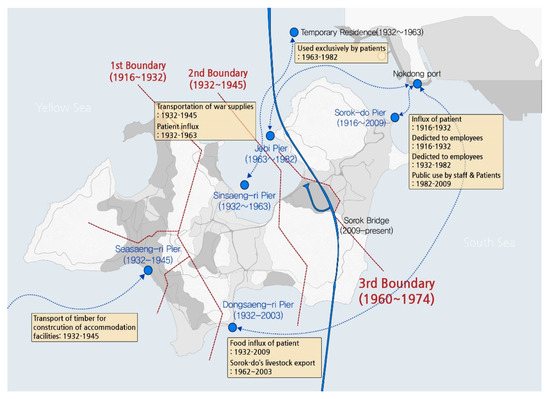 Figure 11). The first, Sorok-do Pier, was closest to Nokdong Port. Until 1932, this pier was the main one facilitating the transport of patients, employees, and goods. In 1923, the construction of the road from Sorok-do Pier to the patients’ residential area at the west end was completed, and in 1932, three piers in Seoseang-ri, Sinsaeng-ri, and Dongsaeng-ri were built for three different purposes within the patients’ residential area [