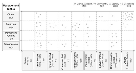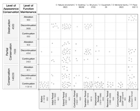 In the second phase, we classified 348 conservation resources into tangible (266 sites) and intangible types (82 sites), which we selected from the collected database. The tangible types are classified into the natural environment, building, structure, installation, memorial facility, and place while the intangible types are classified into incident/event, society/community, landscape, and documents that contain collective memories of the seven stages.