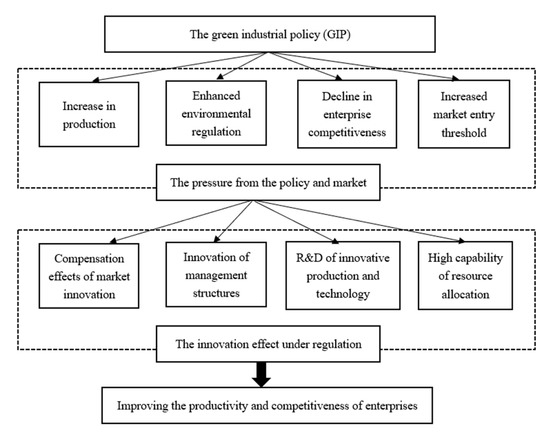 According to the dynamic competition theory of enterprise in environmental regulation and technological innovation [14], GIP requires enterprises to replace backward equipment, and update and adopt advanced technology and equipment to meet the needs of an ecological and green economy. At the same time, environmental industrial regulations push enterprises to increase innovation activities and adopt advanced environmental protection technologies to meet enterprises’ need for competitiveness and regulation compliance [28]. Studies have shown that environmental policies can promote technological innovation in enterprises to achieve a win–win outcome of economic growth and environmental friendliness [29]. Appropriate environmental regulations can stimulate the innovation compensation effect, thus not only to recoup the compliance cost but also increase productivity and enterprise competitiveness (via innovation in production technology and innovation in pollution control technology).