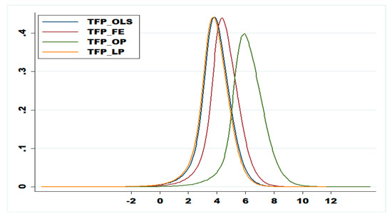 Kernel density function in Figure 2 and correlation coefficient matrix in Table 2 are used to analyze and compare the distribution characteristics, reliability, and correlation of the TFP values estimated by different methods. Figure 2 shows that the value of TFP estimated by the LP method (TFP_LP) is the largest, and the kernel density graph tends to skew to the right. Figure 2 also shows that the estimates of TFP_LP and TFP_OLS are very close to each other (correlation reaches 0.9998), followed by the estimation result of TFP_FE. On the whole, the pairwise correlations between TFP estimated by four alternative methods are fairly high, all above 0.92, whereas the correlations between the value of TFP and labor and capital productivities are fairly low. This suggests that TFP is determined more by the allocation of resources than by the contribution of labor and capital. These results are consistent with other studies and thus can be taken as reliable.
