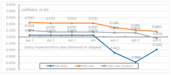 The results in Table 3 and Table 4 have effectively verified H1 and H2, indicating that GIP significantly enhances the production performance (TFP) of enterprises. To further validate the reliability of the results, we also conducted a counterfactual test on the baseline model. If the coefficient values (did-entry, did-exit, and did-new-product) exhibited a certain common trend before and after policy implementation, then the results are reliable.