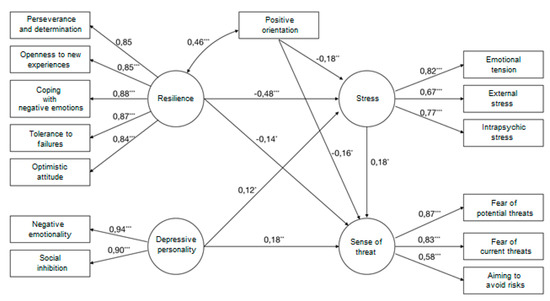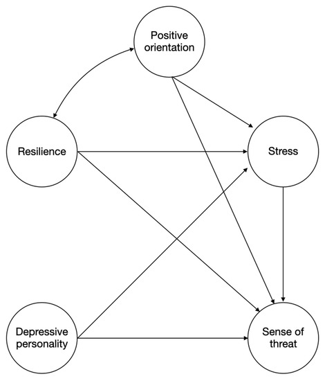 Similarly, positive orientation (β = −0.16, p = 0.013) and resilience (β = −0.14, p = 0.049) were direct negative predictors of a sense of threat, while depressive personality (β = 0.18, p = 0.004) and stress level (β = 0.18, p = 0.023) were positive ones. The model explained 21% of the variance for the sense of threat.