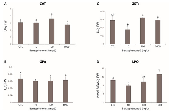 - Liu, H.; Sun, P.; Liu, H.; Yang, S.; Wang, L.; Wang, Z. Hepatic oxidative stress biomarker responses in freshwater fish Carassius auratus exposed to four benzophenone UV filters. Ecotoxicol. Environ. Saf. 2015, 119, 116–122. [Google Scholar] [CrossRef]