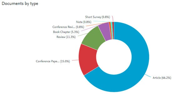 In addition, an analysis according to document type was carried out. As can be seen in Figure 2, 66.2% of the documents are scientific articles, followed by Conference Papers (15.0%).