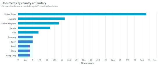 In a similar manner, we analyzed the countries in which these types of studies were being carried out. In Figure 3, it is possible to verify that the countries most involved are The United States, Australia, The United Kingdom, Canada, India, Germany, Spain, Brazil, China, and Hong Kong.