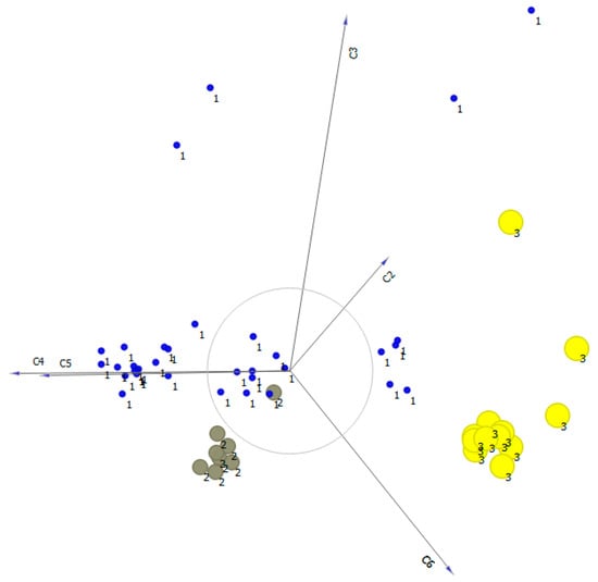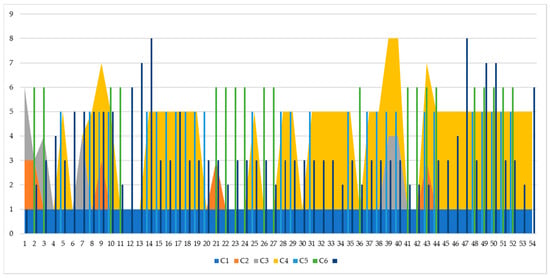 Subsequently, with the Software Orange, [63] the results were viewed from the application of the K-means Clustering Technique. In Figure 6, the distribution of the clusters into the categorization can be seen. As can be verified, Cluster 1 includes categories C2 (Inclusive Society), C4 (Educational Innovation), and C5 (Active Methodologies). With respect to Cluster 2, categories C5 (Active Methodologies) and C6 (Society and Economy) were found. With respect to Cluster 3, it included C2 (Inclusive Society) and C6 (Society and Economy).