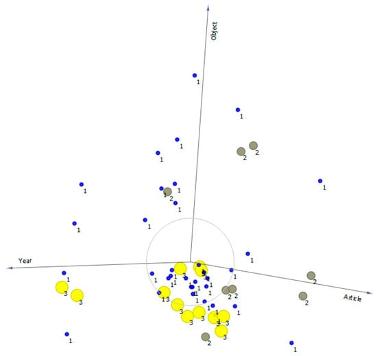 Firstly, K-Means Clustering Technique was applied through the Software SPSS v.24 [64] on the data matrix of the frequencies (Table 1). Three clusters were found, whose distribution according to categorization can be seen in Table 2. Furthermore, the number of the cluster that corresponds with one of the articles studied was maintained (this can see in Table 1).
