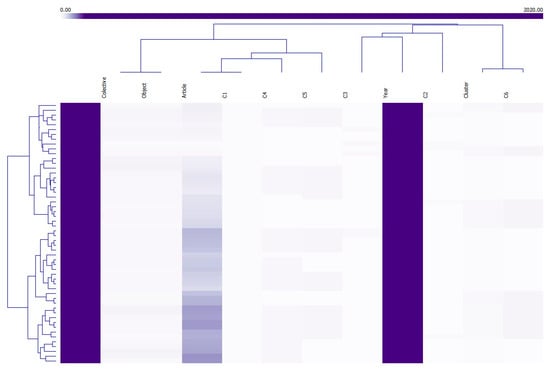 Subsequently, a study on the distribution of the clusters according to the aim of the article and the year of publication was carried out. As can be verified in Figure 7, Clusters 1 and 2 are more related to the aim of the article and year of publication. This result is shown in the heat map that is shown in Figure 8, where the indicators of the greatest differentiation are the aim of the article and the year of publication.