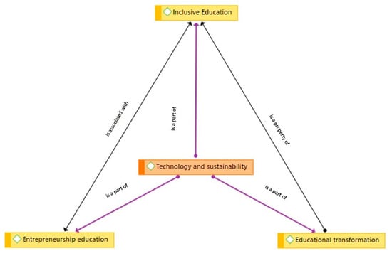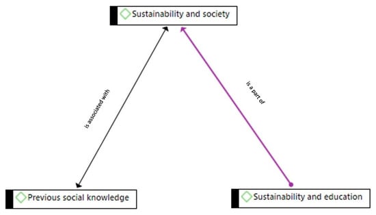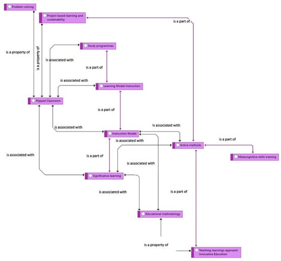 Subsequently, an analysis of networks within learning methodology was carried out (see Figure 9), Educational policy (see Figure 10) and Sustainability society (see Figure 11), where the linkages of “is a property of”; “is a part of”; “is associated with”, and “is associated with” were applied.