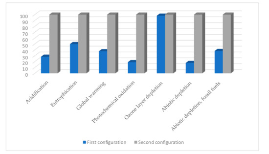 The evaluation of the environmental impacts was performed with SimaPro®, using some of the characterization methods provided by the EPD 2013 [28], are shown in Table 12. The EPD 2013 models the results listed in the data collection and results and discussion section, with the rest of the information required, transportation, energy, and the residuum of the transformation.