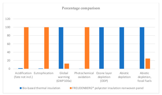 Even when the material proposed in this paper, compared with FREUDENBERG® polyester insulation nonwoven panel [66], has 87.3% more global warming potential impact, 87.3% more ozone depletion impact, 99.99% more abiotic depletion impact and 75.2% more abiotic depletion fossil fuels impact, it has 98.28% less acidification impact, 98.86% less eutrophication impact, and 99.38% less photochemical oxidation impact. On the other hand, when compared with ODE® STARFLEX 042 Glasswool [67] and ISOVER® Glass Wool Insulation 4+ [68] only photochemical oxidation of ISOVER® Glass Wool Insulation 4+ [67] has 10.7% more impact.