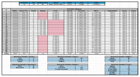 The waste was audited during the period of 15 September 15 to 6 October 2019 in eight wards, and consisted of 939 trays for the main meals. In this study, we included only the patients with solid diets, who represented approximately 89% of the total number of patients admitted to the hospital [21]. Patients with tube feeding, liquid diets and supplements were excluded. The data collection was carried out in two stages. Before the meal was served, all data about all the tray components and the weight of the meals by the ward name and bed type were obtained from the electronic food services system. In order to increase the data accuracy, a random sample from each meal was weighed on a digital scale (MOTEXT weight scale ML 30 N). At this first stage, we recorded the data on an Excel sheet, Figure 2. At the second stage, the overall food waste from each ward for the different medical departments was first sorted daily and weighed separately; then empty packaging and other tray waste were sorted and weighed separately, according to the waste type as follows: plastic, paper, and metal. The waste containers (NAPCO Sanita, G.B.70 G SASO BIO, high-density polyethylene) with tags were set aside in a specified area in the main kitchen to be weighed. All of the waste was weighed three times a day—the morning sample included waste arising from breakfast, the afternoon sample included waste arising from lunch, and the evening sample included waste arising from dinner. Since food is consumed, unlike the other waste made of plastic, paper and metal, we determined the plate waste by dividing the amount of food waste by the amount of food served, using the following equation:
