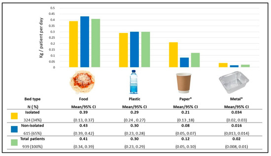 The average tray waste of the food, paper, plastic, and metal were 0.41, 0.30, 0.12, and 0.02 kg per patient per day, respectively. A comparison of the tray waste showed that the paper and metal waste levels were significantly higher among isolated patients—0.21 vs. 0.08, and 0.034 vs. 0.016–kg per patient per day, respectively, with no statistical significance for other tray waste types, Figure 3.