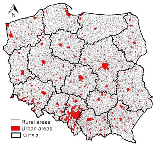 Poland is divided into three regional classification levels (nomenclature of territorial units for statistics, NUTS) and two levels of local administrative units (LAU-1 and LAU-2) [53]. These LAUs are the building blocks of the NUTS and comprise the municipalities of the EU. Until 2016, in the EU, two levels of Local Administrative Units (LAU) existed: the upper LAU level (LAU-1, formerly NUTS-4) and the lower LAU level (LAU-2, formerly NUTS-5) [54]. As of 1 January 2020, in Poland, there are six regions (made up of provinces, NUTS-1), 16 provinces (NUTS-2), 73 sub-regions (made up of districts, NUTS-3), 380 districts (LAU-1), and 2478 communes (municipalities, LAU-2, with 944 urban areas, Figure 1).