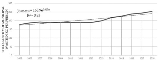 Throughout the studied period, the quantity of collected MW in kilograms per person in analyzed Polish communes was characterized by a steady increase (by 2.5% per year)—from 178 kg per capita in 2005 to 253 kg in 2018, an overall increase of 43%, as seen in Figure 2. However, since 2012, the data show an acceleration of the process—an increase of more than 5% in MW per capita from year to year.