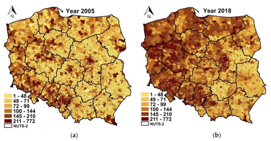Regional disparities among Polish communes in the amount of collected municipal waste (kg per capita) in year 2005 (a) and 2018 (b). Note: to capture the differences in waste amount between 2005 and 2018, the same scale was used for each year on the maps; the average amount in 2005 was 178 kg per capita, and in 2018 it was 253 kg per capita; the descriptive statistics of the waste amount for each year of the analysis is included in Table A1 in the Appendix A.