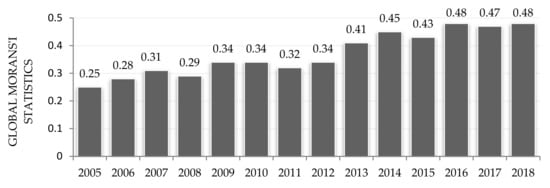 The global spatial autocorrelation of annually collected municipal waste measured by Moran’s I statistic in the years 2005–2018. Source: own elaboration in ArcGIS (ArcMap 10.6). Note: all the values of Moran’s I were statistically significant at level α = 0.05 ***; the first order queen criteria and row standardized spatial matrix was used [56].