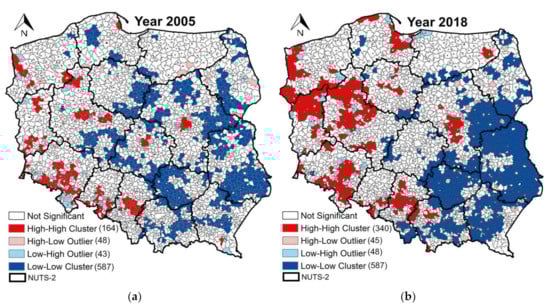 The indices (2) of local Moran’s I spatial association (LISA) detect the sprawl and changes in spatial clustering of communes in term of the quantity of municipal waste in two years: 2005 and 2018 (Figure 6).