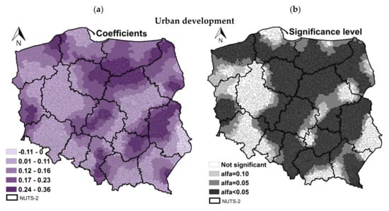 Local coefficients (a) and significance level (b) in the GWR–SEM models. Source: own elaboration in ArcGIS (ArcMap 10.6).