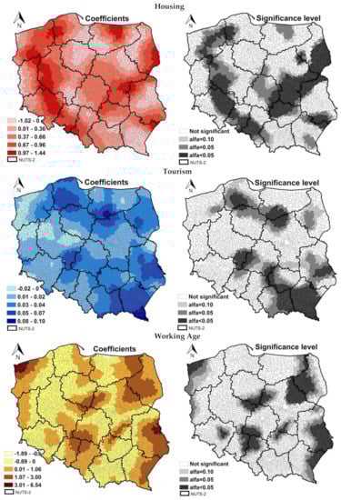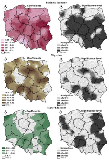 The coefficients βk in GWR are functions of spatial location and take different values for each point (here, for each analyzed commune), and as a result, this model enables identification of the variability of regression coefficients in the geographical space.