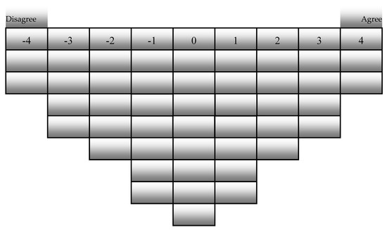 Before sorting, the purpose of the study was explained to the participants. The participants were encouraged to choose the viewpoints from their own perspective and not simply agree/disagree according to “official” viewpoints. Two open questions were asked before formal sorting, viz., (a) briefly outline what you understand about the relationship between geography education and environmental education; and (b) do you agree that MT will have an effect on EE? If so, how? If not, why? These two questions were designed to help adjust the mindsets of the participants. Instructions for completion of the Q-sort were then given as follows: (i) carry out the survey in a quiet environment; (ii) after carefully reading the statements, classify each one into three categories, viz., agree, disagree, unsure; (iii) select the two statements that you most strongly agree with and place these in the column under the +4 marker; (iv) highlight these two statements in order to facilitate their later selection; (v) as in (iv) above, select and highlight the two statements that you most strongly disagree with; (vi) continue as above, progressively selecting the remaining statements that you most strongly agree/disagree with and place them in the appropriate box. The participants were then asked to send a 60-s voice message via WeChat, which was then transcribed, or to write a brief comment. Finally, the instructor conducted a short interview with the participants, asking them to explain their sorting of viewpoints [63]. The interview consisted of five questions as follows: (1) Please explain why you most strongly agree with the two viewpoints in column +4. (2) Why do you most strongly disagree with the two viewpoints in column -4? (3) Why do you agree with the four viewpoints in column +3? (4) Why do you disagree with four viewpoints in column -3? (5) What other points would you like to make?