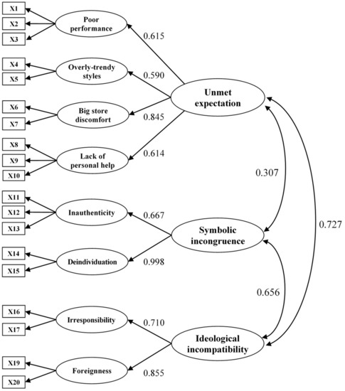 In Spain, unmet expectations were reflected in poor performance, big store discomfort, and the lack of help. The higher-order construct of symbolic style, which consisted of overly trendy style, inauthenticity, and irresponsibility, was confirmed as a higher-order construct (Figure 2). Deindividuation and foreignness were not included in the avoidance beliefs in fast fashion in Spain. Consumers in Spain are not likely to perceive foreignness and deindividuation as negative beliefs of fast fashion, which is understandable considering the long history and birth of fast fashion brands in Spain.