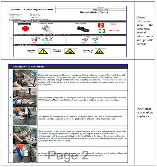 An example of the standard operating procedure for unlocking spring-vents is provided. Spring-vents are small valves allowing the air from the mold to be removed during the curing process. For drafting the procedure, the activities were monitored, and the time was registered for several consecutive days and during the various shifts. Opportunities were identified for improving the time or for the working operation mode, as seen in Figure 23.