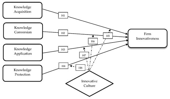 Additionally, through innovative culture, knowledge can be easily shared among employees and the sharing will ultimately enhance the creation of new ideas which will lead to better performance []. In the same vein, innovative culture may be crucial in linking technological knowledge-based assets and innovation as the approach for using technological resources are the essence in deciding the optimum usage of resources and capabilities of the organisation []. It was found recently that innovative culture influences supervisors and employees to accept innovative activities that encourage the organisation to be innovative []. Accordingly, the hypothesis is formulated as: “The positive relationship between knowledge management and firm innovativeness will be enhanced when innovative culture is high”. Based on the developed hypothesis, this study will investigate the moderating role of innovative culture on the relationships between knowledge management and firm innovativeness from four perspectives of KM, i.e., knowledge acquisition (H5), knowledge conversion (H6), knowledge application (H7) and knowledge protection (H8). Figure 1 depicts the conceptual model of the present study.