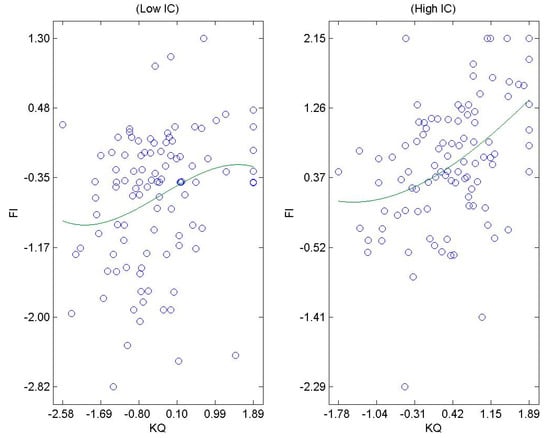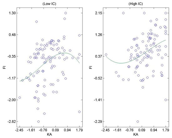 The results further highlight that innovative culture enhances two of the relationships of knowledge management and firm innovativeness, namely knowledge acquisition and knowledge application, thus supporting H5 and H7, respectively. The findings correspond with a study by Jim Navare and Lynch [] where innovative culture was found to drive organisations towards innovativeness, as well as by Wang and Chen [], who advocated that innovative culture enhances these relationships. The plot of the moderation effect of innovative culture on the relationship knowledge acquisition and firm innovativeness is represented in Figure 2 while moderation effects of innovative culture between knowledge application and firm innovativeness is illustrated in Figure 3. The findings of the present study support the above assertions that innovative culture enhances the positive relationship between knowledge acquisition and firm innovativeness. When organisations practice high level of innovative culture, it increases innovative practices in the organisation []. By acquiring knowledge, this will result in a positive impact on firm innovativeness and hence, innovative culture is found to amplify this effect. The results of the present study underline the fact that innovative culture plays a significant impact in enhancing creativity among employees and encourages them to develop the necessary skills that improve innovativeness within the firms. Furthermore, the findings correspond with the study by Kfir [], who found that innovative culture supports the ideation of innovative products and practices in organisations. This indicates that when innovative culture is nurtured by MSC Malaysia firms, employees and the organisations will benefit from it.
