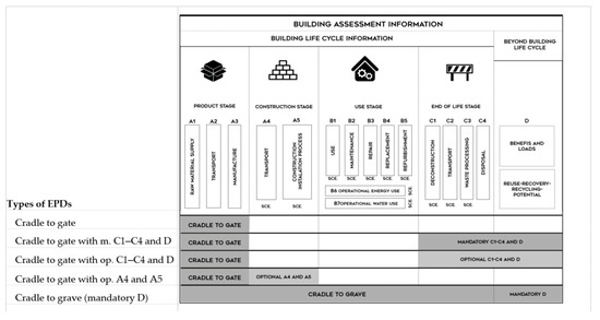 Building assessment information modules and types of EPDs according to EN15804:2012+A2:2019 [19] standard.