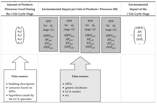 Figure 2 shows that according to the EN 15978 [20] standard, the basic principle of the matrix calculation routine consists of multiplying each product and service quantified (bill of quantities) in a certain module of the life cycle of the building by its respective environmental indicator value per unit of products/processes.