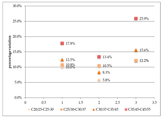 Percentage of difference of the impact indicators from Compressive strength class 20 to class 55.