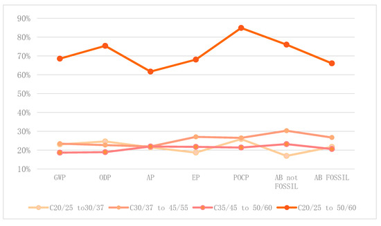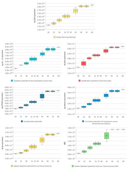 Therefore, given the lack of available data, the study is limited to the impacts produced during the production phase (module A1–A3). As mentioned above, to limit the study, only the impact categories reported in Table 2 are shown.