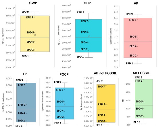 Variability of the selected EPD indicators for each of the seven environmental impact categories (GWP, ODP, AP, EP, POCP, ADPe, ADPf).