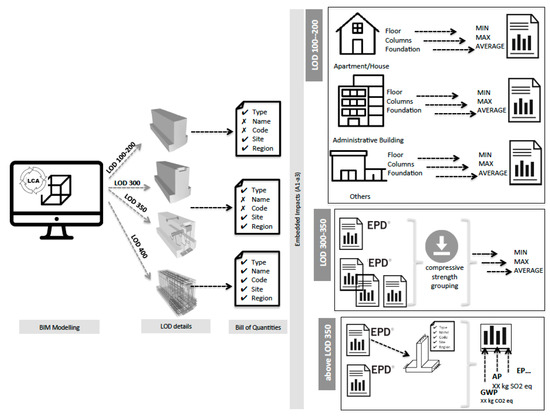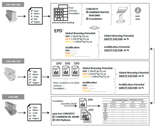 The problem of data granularity in conducting BIM-based LCA was also addressed by Cavalliere et al. [36], by using BIM and mixing LCA databases with different levels of detail. The method divides the building into functional elements and construction categories and matches the LOD of these elements with different LCA databases, but does not propose a strategy to deal with information at a material or product level (such as EPD). Santos et al. [37] proposed an approach for dealing with (environmental and economic) enriched BIM objects to conduct LCA in BIM considering early and detailed design stages (streamlined and complete LCA) and, like Durão et al. [38], they proposed the use of generic environmental information (e.g., generic databases) for lower LODs and more specific information (e.g., EPD) for higher LODs. In theory, this is a suitable way to include EPD indicators in the BIM-based LCA, however, there may be no correspondence or consistency between the LCA results and the LOD of the BIM model in the design stages.