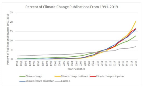 This paper now moves to demonstrate the emergence of, and the relations between these terms—mitigation, adaptation, resilience—in the academic literature related to climate change. We use 1991 as out starting point, as already discussed, and conclude with material published in 2019, as publications were continually being added during data collection and included “in press” publications dated 2021 and even 2022.