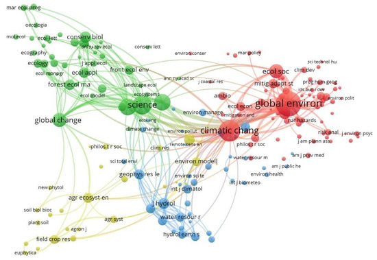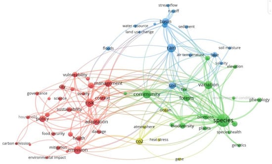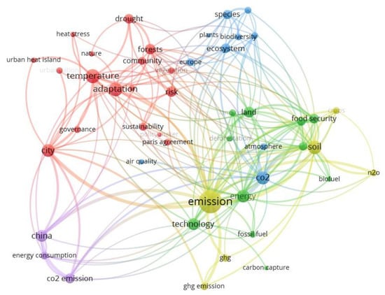VOSviewer output co-occurrences, WoS topic “Climate change”: See Section 2 for details.