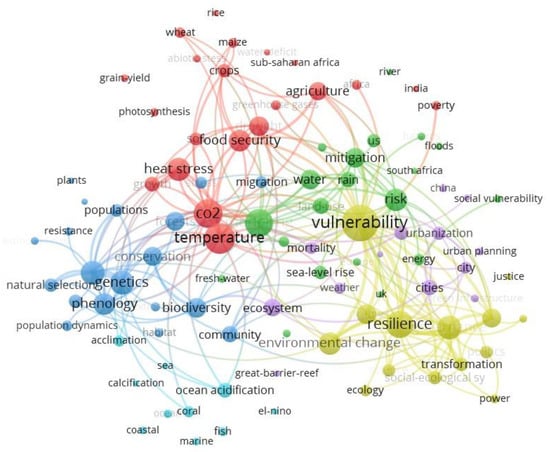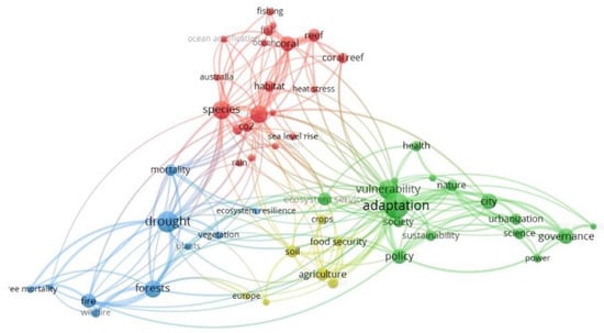 In this section, we look specifically at the “resilience” concept in the context of highly cited papers in WoS which also contain the keyword “climate”. In contrast to Figure 4, this mapping is more tightly displayed (Figure 5, Table 8). The green cluster is very closely connecting adaptation, sustainability and governance, while yellow links agricultural topics. The blue cluster brings together drought, forests and fire, while in red are clustered habitat, species, CO2 and heat stress.