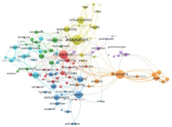 We interpret this display of 3689 highly cited papers within the climate change literature over the past three decades as having four distinct components. One (in blue) highlights the natural cycle of rainfall and runoff, which is subject to change by a rapidly changing climate. A second (green) links climate change to species health. A third cluster (yellow) is one we have labeled “CO2 fixation” and is connected to a small but active research area focused on heat stress and the process of CO2 fixation in genetically modified crops [31]. The fourth and largest (red) cluster is defined by risk and vulnerability, adaptation and mitigation, and sustainability and management, and includes cities, governance and science. Although adaptation is a keyword of importance in ecological and agricultural contexts (see Table 6), it is also prevalent in the context of urban and regional planning (see for example Figure 3), and its appearance in this cluster reflects that usage.