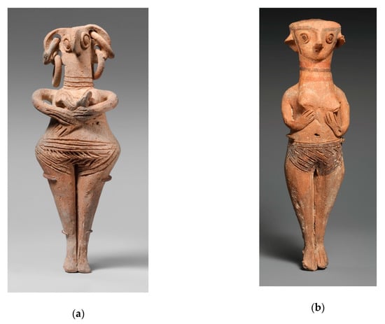 The “bull” rhyton [52,53] (Figure 3), introduced in LC IIA, stylistically is an extension of Base Ring pottery production; these vessels have similar surface treatment, including slip and white-painted linear decoration and were undoubtedly made in the Base Ring workshops. These are sturdy little vases standing on four short legs, with a cylindrical body and shoulder hump, handle attached to the back and a modelled tail. The head is realistically modelled with relief pellet eyes, modelled ears, and horns; there is an aperture in the nostril for pouring liquid, and there is an aperture on the back, placed in front of the handle, for filling the vase. Closely related to this form are Base Ring bovine figurines (differentiated by the absence of spout, pouring hole and handle). Two types of female figurine were likewise fashioned from the Base Ring pastes from LC IIA: the bird-faced or earring figurines (Figure 4a) and the flat headed figurines (Figure 4b) [45]. In contrast to the bovine vases and figurines, the surface treatment of these female figurines was very different, being unslipped and with a typically light buff surface colour. The facial and body details were primarily modelled in clay, with relief pellet eyes, pinched nose, and modelled ears and breasts, but with incisions marking the pubic triangle. The flat headed figurines had painted bands (matte red and black paint) around the neck and dark washy paint over the pubic triangle. The skills involved in knowing where to procure and how to work with the Base Ring pastes to form these figures indicate that these were produced by skilled potters, which is further substantiated by Knox’s observation [45] (p. 168, Figure 66) that the attachment of the legs and arms used the same techniques as the attachment of handles of pottery vessels, which were thrust through the body.