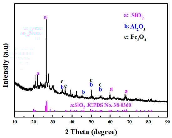 The measured parameter values of DWTS were: pH 6.80, DO 2.32 mg/L, EC 7.34 mS/m, ORP 167.4 mV, SS 42.66 g/L, VSS 6.58 g/L, TDN 13.53 mg/L, DP 4.30 mg/L, DOC 6.5 mg/L and UV260 10.91 m−1. For initial EAS, the measured parameter were: pH 6.22, DO 0.58 mg/L, EC 60.6 mS/m, ORP−171.7 mV, TS 11.37 g/L, vs. 8.34 g/L, SS 10.42 g/L, VSS 7.98 g/L, TDN 16.18 mg/L, DP 354.87 mg/L, DOC 14.4 mg/L and UV260 71.6 m−1. A high DO value of DWTS was associated with being aerated for 36 h. The aim of aeration is to accelerate the microbial consumption [42], strengthen the degradation of the organic matter in DWTS and reduce the impact of organic matter on batch tests. The EAS contained high content of EC, TDN, DP, DOC and UV260 which also indicates that the content of organic pollutants in EAS was higher than those of DWTS. X-ray diffraction analysis result of DWTS is shown in Figure 1, indicating that the inorganic components are mainly composed of silicon dioxide [43,44]. Meanwhile, crystalline phase of Al2O3 and Fe3O4 were detected in the low intensity peaks.