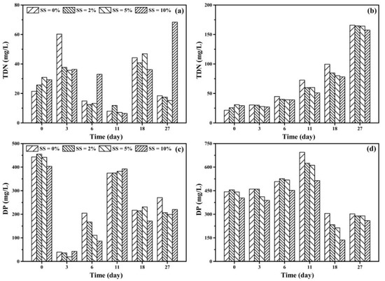 N and P are necessary to maintain bacterial growth and biodegradation. The TDN and DP concentrations at different DWTS dosages are shown in Figure 2. For aerobic EAS, there was no obvious evidence that adding DWTS can promote the removal of TDN in the supernatant, as could be seen from Figure 2a. On the contrary, the addition of DWTS may release a certain amount of nitrogen. As shown in Figure 2b, there has been a marked increase in the TDN concentration during the anaerobic digestion. It seems possible that this result could be attributed to microbial cells lysis, releasing intracellular nutrients [45,46]. For anaerobic EAS, TDN removal efficiency increased gradually with the increase in the dosage of DWTS. When DWTS was dosed at SS concentration of 10%, the highest TDN removal efficiency was increased to 29.97% on day 11. These results may be due to the adsorption of dissolved organic nitrogen on amorphous aluminum hydroxide precipitate and charge neutralization at nearly neutral pH values [47]. The pH changes of supernatant after adding DWTS are displayed in the Table 1. As analyzed in Table 1, DWTS can slightly neutralize the acidic conditions of aerobic and anaerobic supernatant. According to Figure 2, it was found that TDN concentration in aerobic digestion liquid was lower than that in anaerobic digestion liquid, and this observation could be associated with microbial metabolism and nitrogen volatilization which may be caused by aeration under aerobic condition.