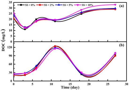 The change of dissolved organic carbon (DOC) concentration in the supernatant with different dosage of DWTS during 27 days’ digestion. (a): aerobic EAS; (b): anaerobic EAS.
