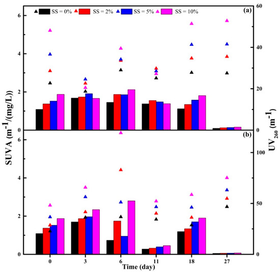 Effect of DWTS on the change of UV260 and specific ultraviolet absorbance (SUVA) values during 27 days’ digestion. (a): aerobic EAS; (b): anaerobic EAS.