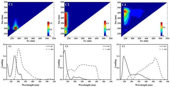 Three components identified by PARAFAC analysis and Ex/Em loadings. C1: protein-tyrosine-like component; C2: protein-tyrosine-like and fulvic-like component; C3: fulvic-like and humic-like component.