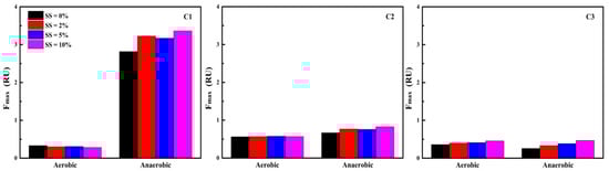 PARAFAC analysis can describe the distribution of three components in the samples by using Fmax to represent fluorescence [57]. Fmax values of the three components in the supernatant samples at the end of digestion for 27 days are shown in Figure 6. After adding different dosage of DWTS, there was no obvious change in Fmax values of C2 for aerobic EAS. However, C1 was reduced slightly and C3 gradually increased when the dosage of DWTS was increased. For anaerobic EAS, Fmax values of C1 displayed an increasing trend with the increase of DWTS addition amount; C2 and C3 also exhibited a similar trend. This indicated that organic pollutants were continuously released in anaerobic digestion liquid. Meanwhile, the Fmax values of C1 in anaerobic digestion liquid were higher than that in aerobic digestion liquid. This suggests that protein-tyrosine-like substances are the major components in anaerobic supernatant samples.